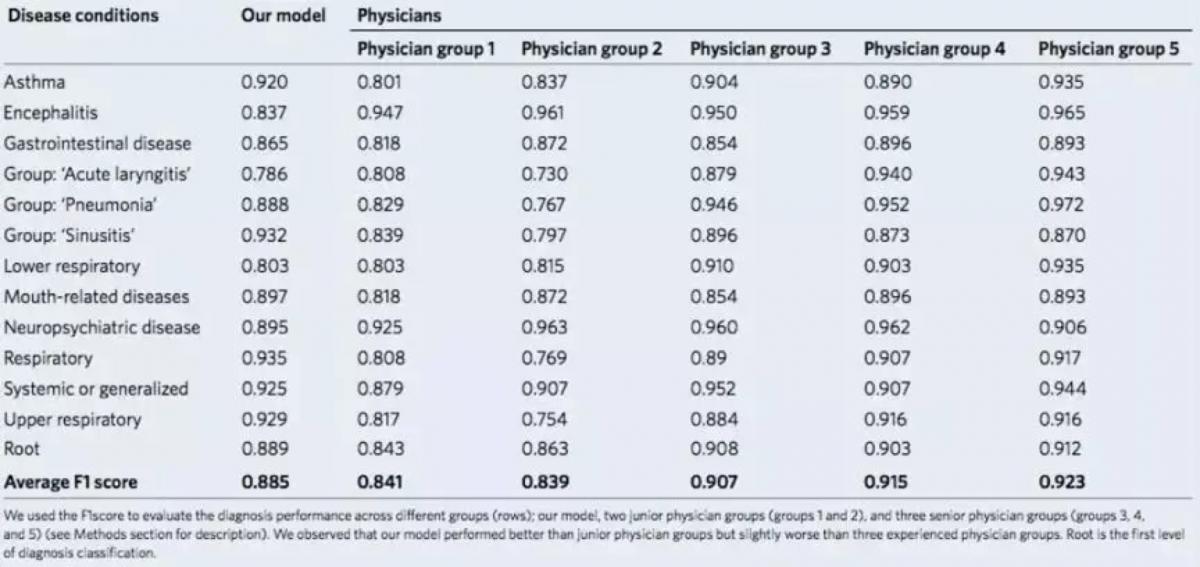 数据显示,人工智能可以达到训练有素的儿科主治医生的专业水准,在常见儿童疾病方面的综合诊断准确率优于相对低年资儿科医生(3年+8年临床经验)。