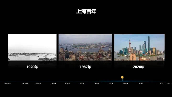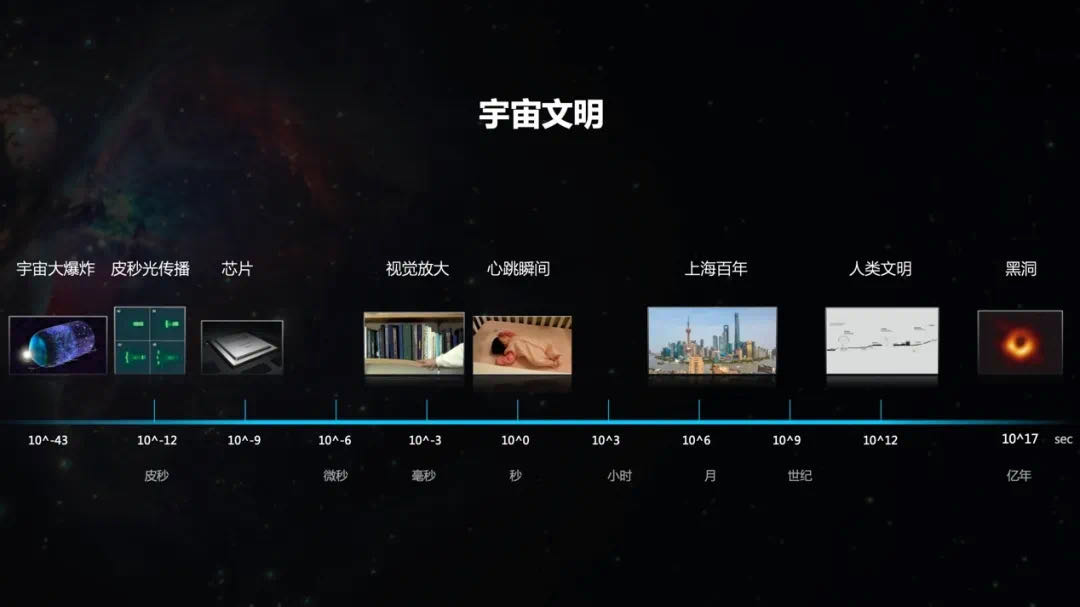 我们所知的宇宙中最小的时间是宇宙大爆炸的十的负四十三次方秒,从这个最小的时间单位,到人类心跳瞬间的1秒,再到城市的历史,再到人类的历史,再到更遥远的人类试图观察距今几亿年前的银河系的历史,这是从时间轴和物理世界看宇宙文明的发展变迁。