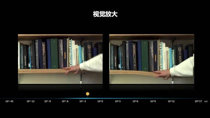 我们再看一秒尺度下物理世界的变迁。下面这组照片,左边这张是正常拍摄下人眼看到的手撑住书架,右边这张图是用机器看到视频当中不同频率的信号捕捉出来微小的震动,把它放大100倍、1000倍之后,能够看到木材是如何受力的,这在时间纬度上是非常细微的。
