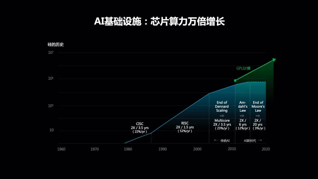 过去几十年,算力发展分为两个阶段,一个是蓝色这条曲线,一个是绿色这条曲线,我们分别把它叫做旧时代的或传统时代的芯片,以及新时代的基于GPU 或为AI计算定制的芯片。蓝色曲线基于传统摩尔定律发展,性能每隔18--24个月提升一倍;绿色曲线是加速的超摩尔时代的芯片算力,过去几年间,AI算力翻了接近一万倍,单个GPU的算力比过去基于CPU的算力多了一千倍。