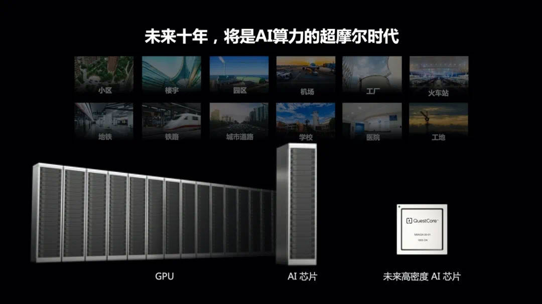 几年前,一个城市管理要用到的智能计算,需要十几个机柜提供算力支持,需要非常大的空间、投资以及大量的能耗;一年前,由于AI芯片性能的提升,已经能够由十几个柜降到一个机柜。