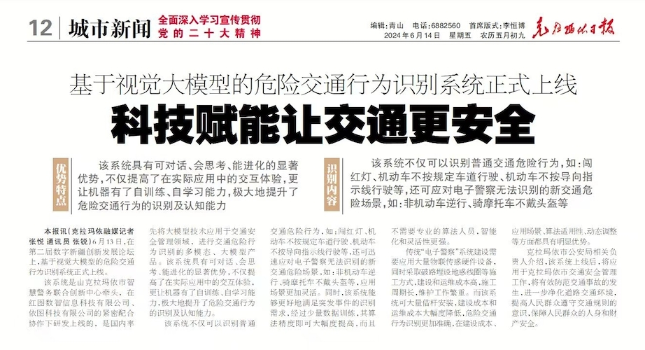 在本届论坛上,由克拉玛依市智慧警务联合创新中心牵头,基于依图天问大模型的危险交通行为识别系统正式上线。该系统是国内率先将大模型技术应用于交通安全管理领域,进行交通危险行为识别的大模型产品。